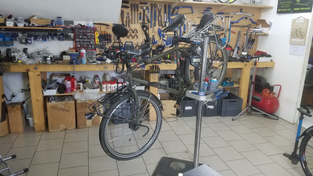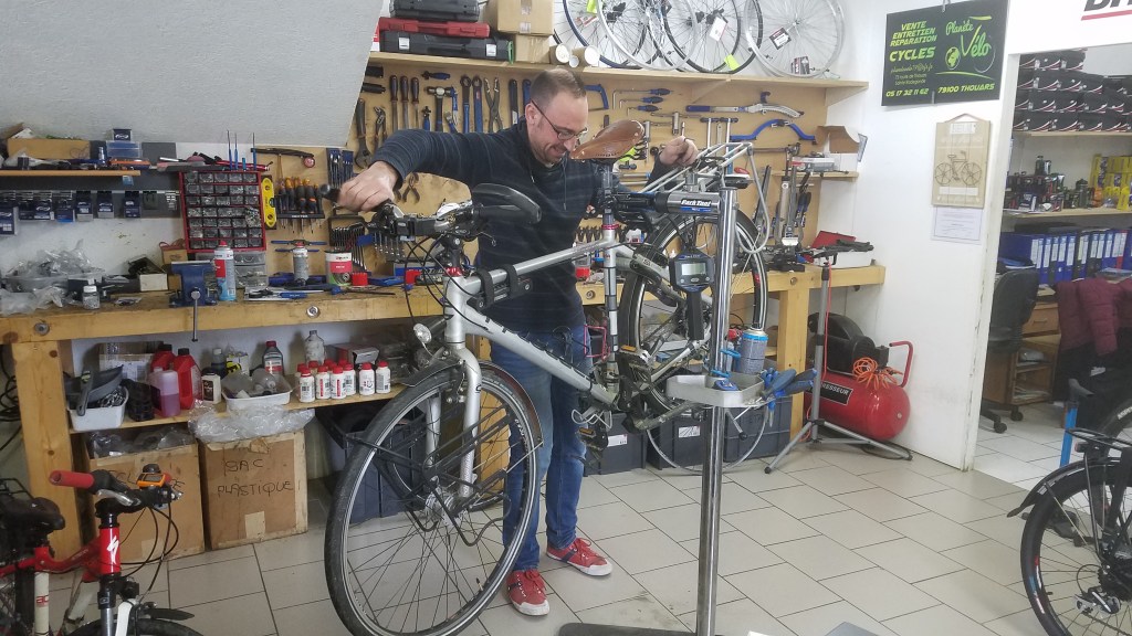 Une bonne vérification des vélos s’imposait avant le grand départ. Arnaud de Planète Vélo 79 à pris soin de nos chers montures pour partir en toute sérénité.
