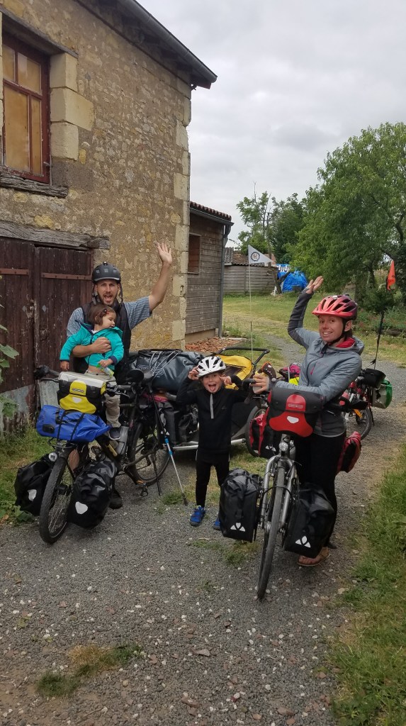 Derniers au revoir aux voisins et c’est parti. Au vu de l’heure nous avions attelé Arthur qui a finalement souhaité pédaler tout seul les 10 derniers kilomètres !
