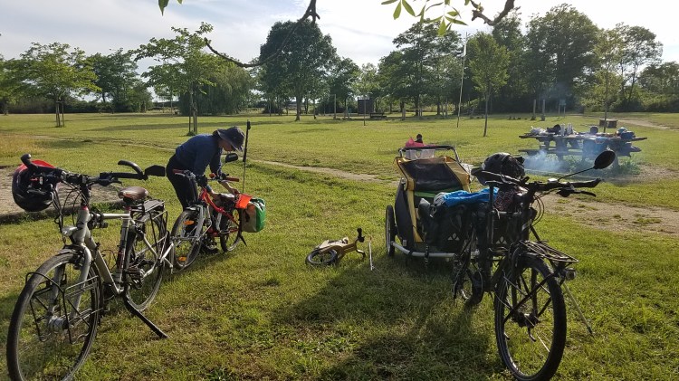 Un pique-nique au bord du canal nous requinque avant de repartir en direction de Marennes. Cette fois le vent nous joue des tours et les 13kms dans le marais sont bien fatigants. Résultat Arthur fait une sieste dans la remorque et Eléanor s’endort la tête sur la sacoche de guidon malgré les secousses. Une première!