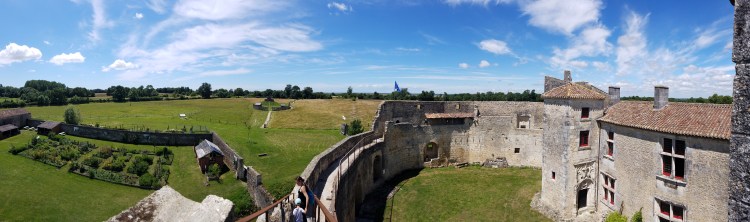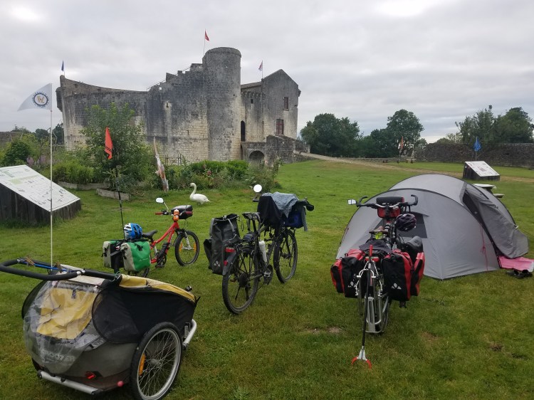 Samedi 20 juin peu de kilomètre nous séparent du château de Saint Jean d’Angle. Nous arrivons un peu avant midi, posons les vélos et demandons si nous pouvons entrer la remorque et discutons un peu avec les personnes s’occupant du château curieux de notre voyage et chargement ! La visite du parc et du château est superbe, les animations et les panneaux explicatifs du site et de l’époque sont ludiques et enrichissants pour petits et grands. Le jeu mis en place pour la visite nous emmène dans tous les recoins du domaine (animaux, jardins, jeux, machines de guerre de l’époque, château aménagé…)… nous y passons la journée. Puis 17h30 approchant, il fallait se décider d’un bivouac pour la nuit qui arrivait. Indécis et, en ce qui me concerne bien fatiguée par la route du matin, le soleil et la journée au château, on choisit de rester dans le secteur. Fort de notre expérience de la veille, nous demandons aux locaux ( les propriétaires du château avec qui nous avions plusieurs fois échangé tout au long de la journée) conseil ! C’est avec surprise, un peu ahuris et heureux comme des poisons dans l’eau que nous les avons entendu nous proposer de jouer les gardiens du château pour la nuit. Le bonheur pour les enfants, la chance pour les parents, admirer ce beau paysage (La cour du château !) avec cette superbe lumière de fin de journée. Les propriétaires s’en vont et nous voici VRAIMENT les gardiens… sourires jusqu’aux oreilles nous mangeons puis refaisons le tour du château avant d’aller nous coucher. C’est avec joie que nous retrouver le lendemain matin André et Marie, les propriétaires, et que nous faisons plus ample connaissance. Arthur et Eléanor vont nourrir les animaux avec eux, couper les fleurs à la roseraie, faire un tour de quad, rererefaire le tour du château ! Nous partons ravis de cette rencontre et avons hâte de pouvoir revenir raconter notre voyage !