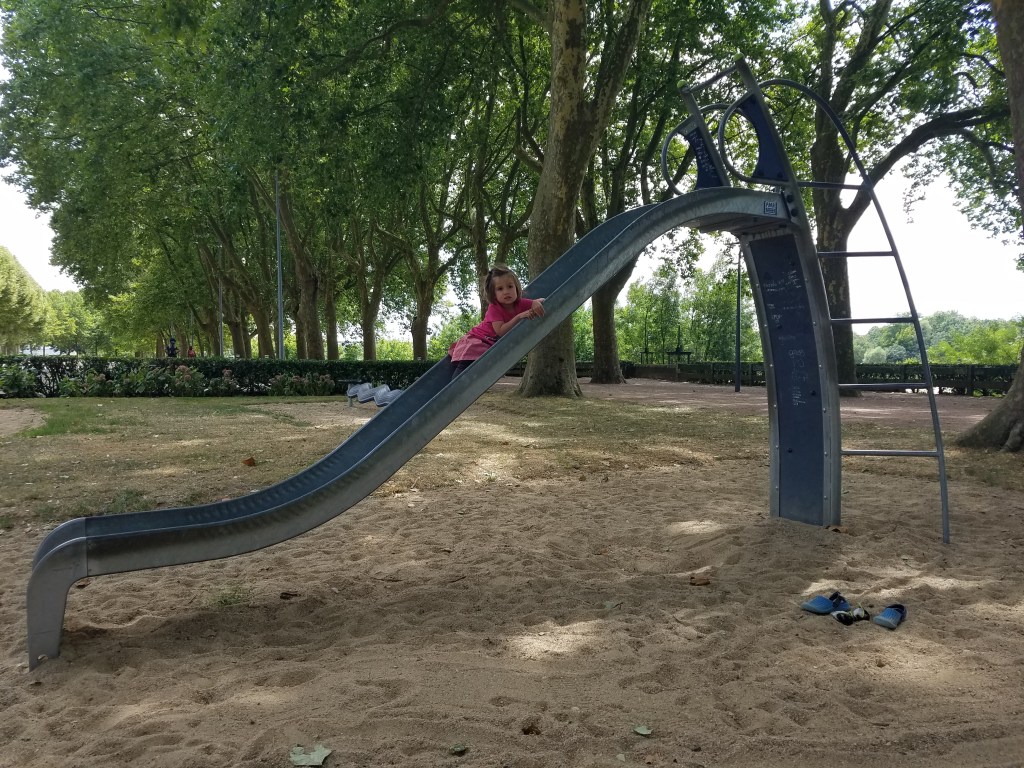 L’aire de jeux à l’ombre des platanes nous offre une pause le temps du repas. Les enfants passent bien peu de temps à manger, ils ont des jeux à découvrir !